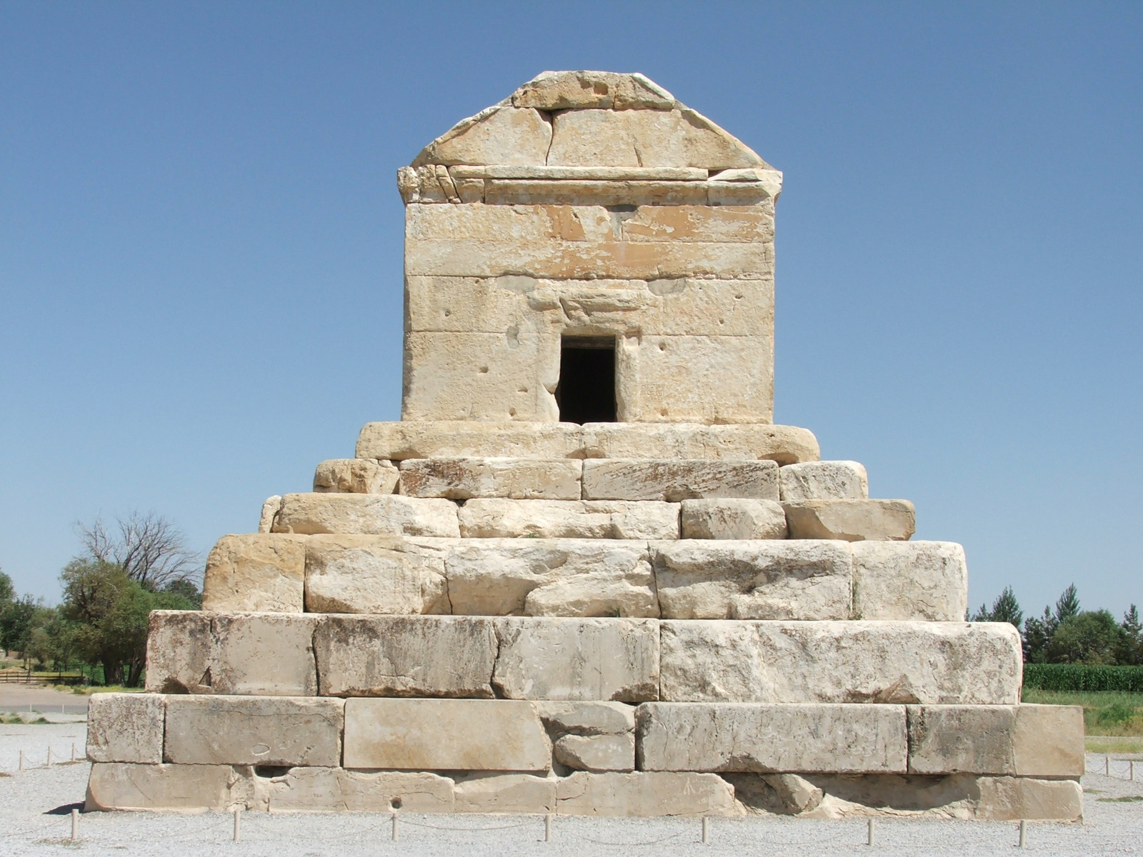 Dans L’Anabase d’Alexandre (VI, 29), l’auteur grec Arrien (IIe siècle après J.-C.) raconte que pendant sa conquête de Persépolis en 330 avant J.-C., Alexandre le Grand visite la tombe de Cyrus. Il y trouve une table dressée, un lit et un cercueil en or ainsi que des bijoux sertis de pierres précieuses. Il aurait lu sur le tombeau cette inscription : « Passant, je suis Cyrus le Grand, j'ai donné aux Perses un Empire et j'ai régné sur l'Asie, alors ne jalouse pas ma tombe. »
