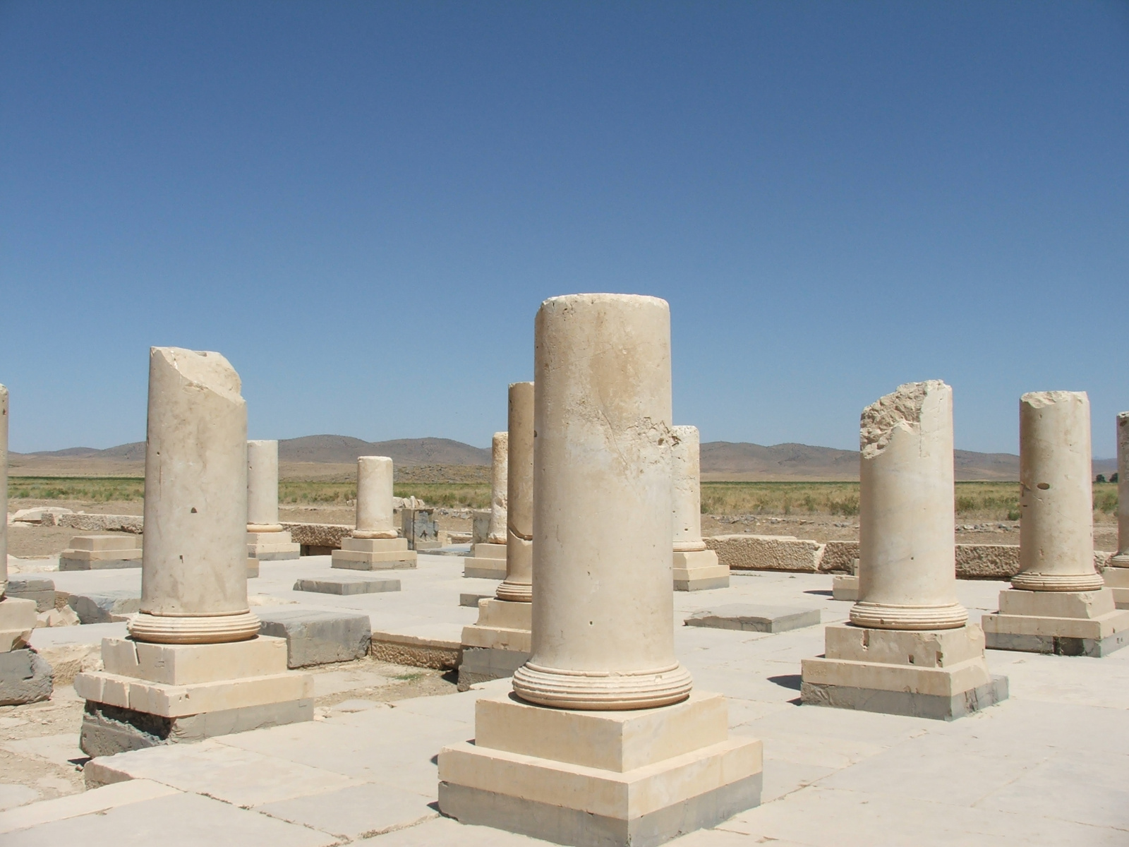 Le palais P, dans l’axe du jardin, mesurait plus de 70 mètres avec de longs portiques, caractéristiques de l’architecture achéménide. Il comportait également une salle hypostyle. La base des colonnes alterne une pierre noire et une pierre blanche surmontée d’un tore à cannelures qui rappelle le temple d’Artémis à Éphèse. Au milieu du portique, un vestige de banquette est interprété comme le siège du roi. C’est à Pasargades que se déroulait la cérémonie d’investiture des rois achéménides.