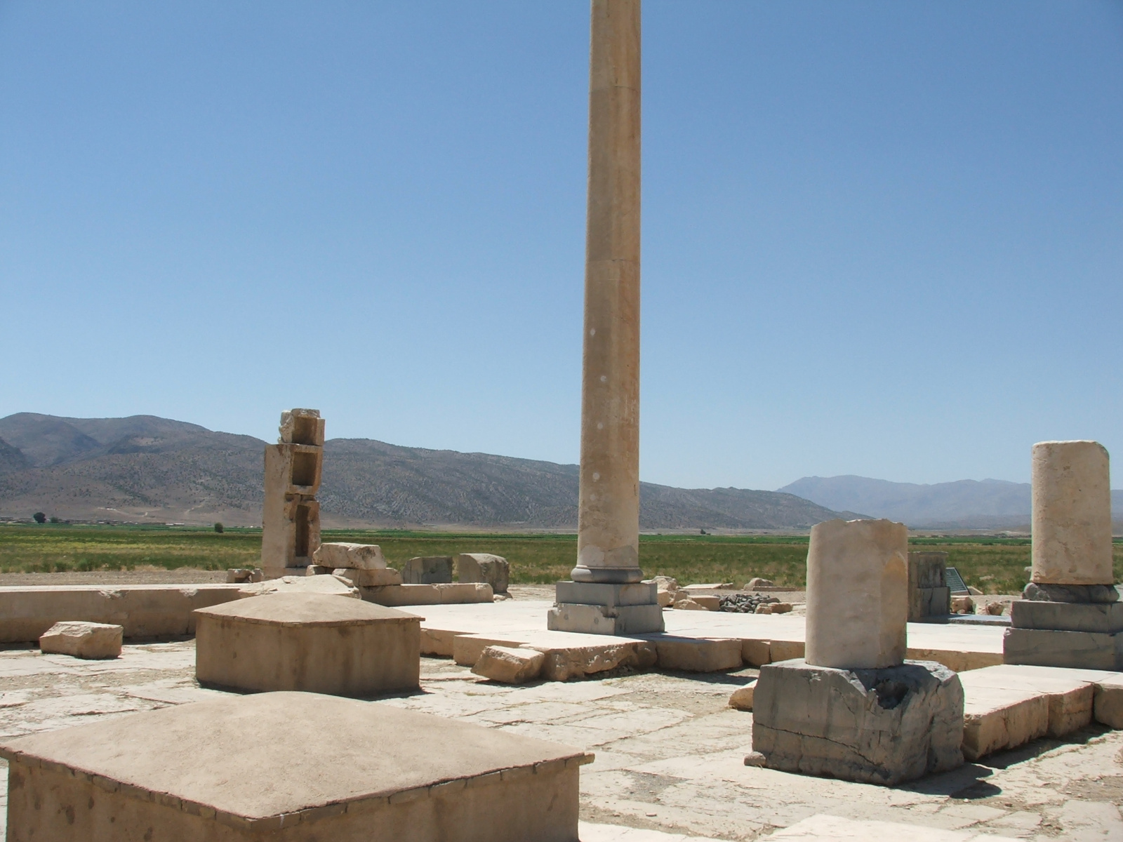Cette colonne lisse en pierre blanche, la plus ancienne connue en Iran, mesure plus de 13 mètres de haut. Coiffées de chapiteaux en forme de buste d’animal, deux rangées de colonnes supportaient le toit de la salle centrale d’une impressionnante construction hypostyle à quatre portiques, nommée palais S. L’espace majestueux de cet édifice, de plus de 20 mètres de long, était probablement une salle d’audience. On a relevé trois des antes qui encadraient les murs ; l’une d’elle s’élève à gauche.