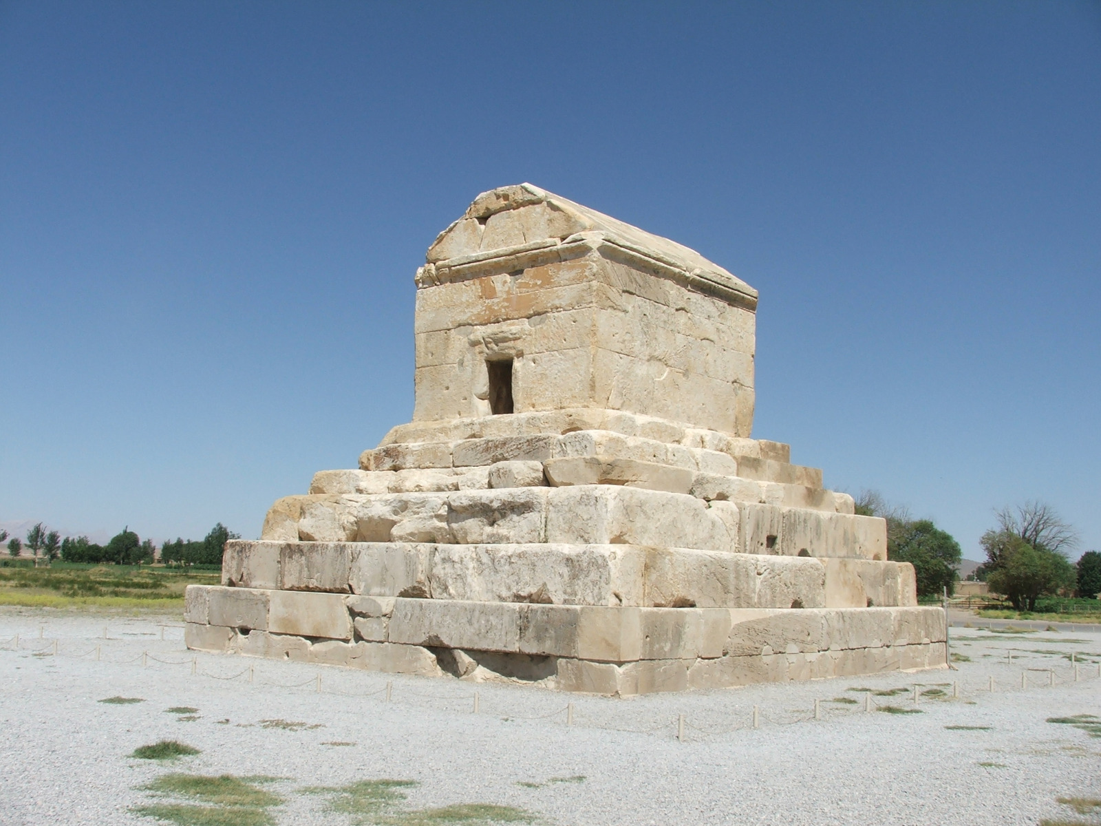 La tombe de Cyrus, mort en 529 avant J.-C., est érigée sur six degrés en retraits successifs. La construction en pierre, en forme de maison, s’élève à plus de 11 mètres de hauteur. Une rosette orne le dessus de la porte. Ce monument, le plus connu de Pasargades, était entouré de verdure, un espace qualifié par les auteurs grecs de « paradis » (cf. παράδεισος « parc », mot d’origine perse), et peut-être intégré au grand jardin royal, irrigué par des canaux, autour duquel s’élevait le quartier royal.