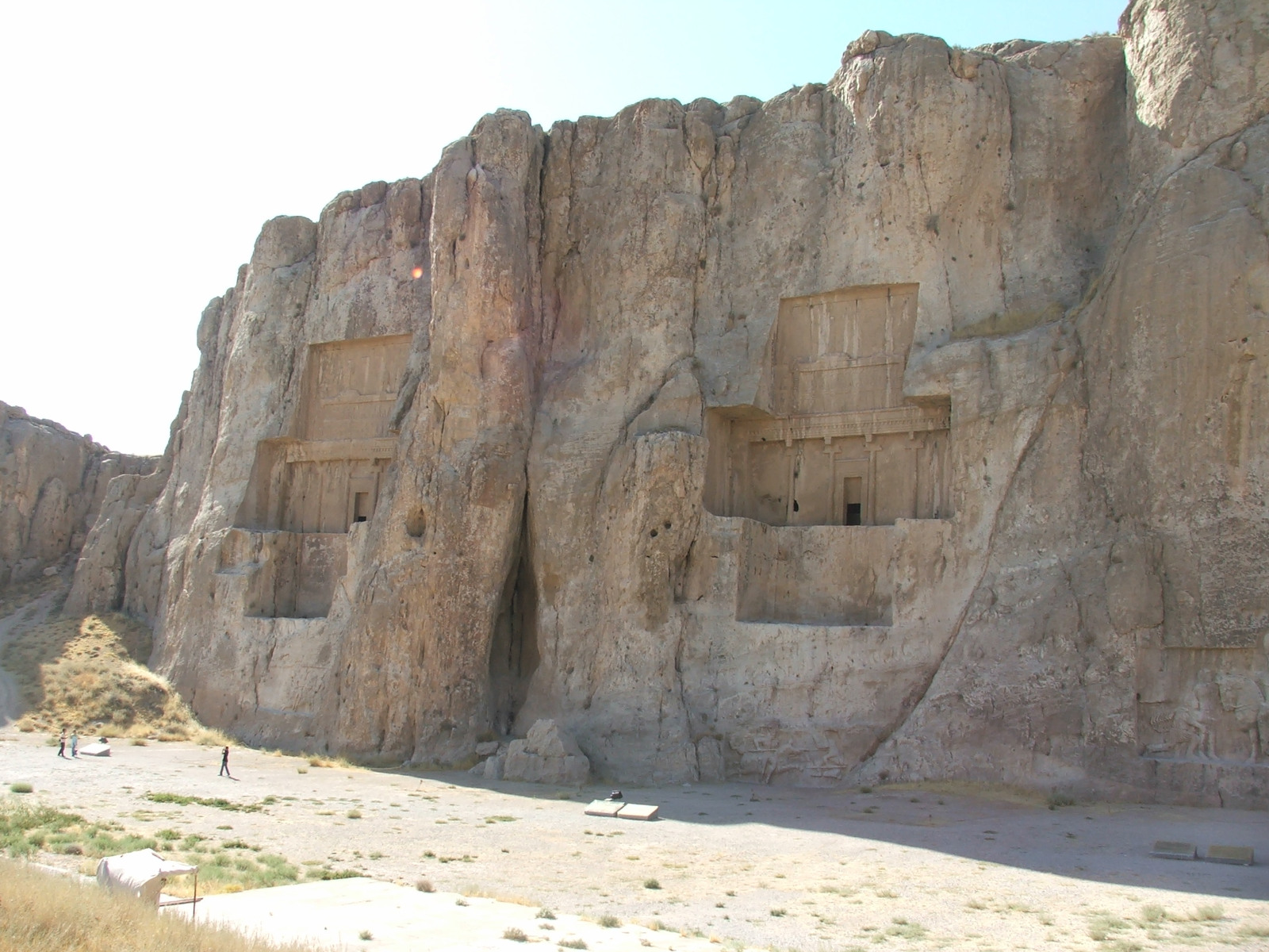 À cinq kilomètres de Persépolis, dans la province du Fars (Iran), la ceinture rocheuse de Naqsh-e Rostam abrite quatre tombes de rois achéménides qui ont régné sur l’Empire perse. Seule celle de Darius Ier (521-486 avant J.-C.) est attestée par une inscription. Les autres pourraient être destinées à Xerxès Ier et Artaxerxès Ier, ses descendants, et Darius II (424-404 avant J.-C.), ici à gauche. En forme de croix sculptée, chaque tombe offre une porte centrale qui débouche sur la chambre funéraire.
