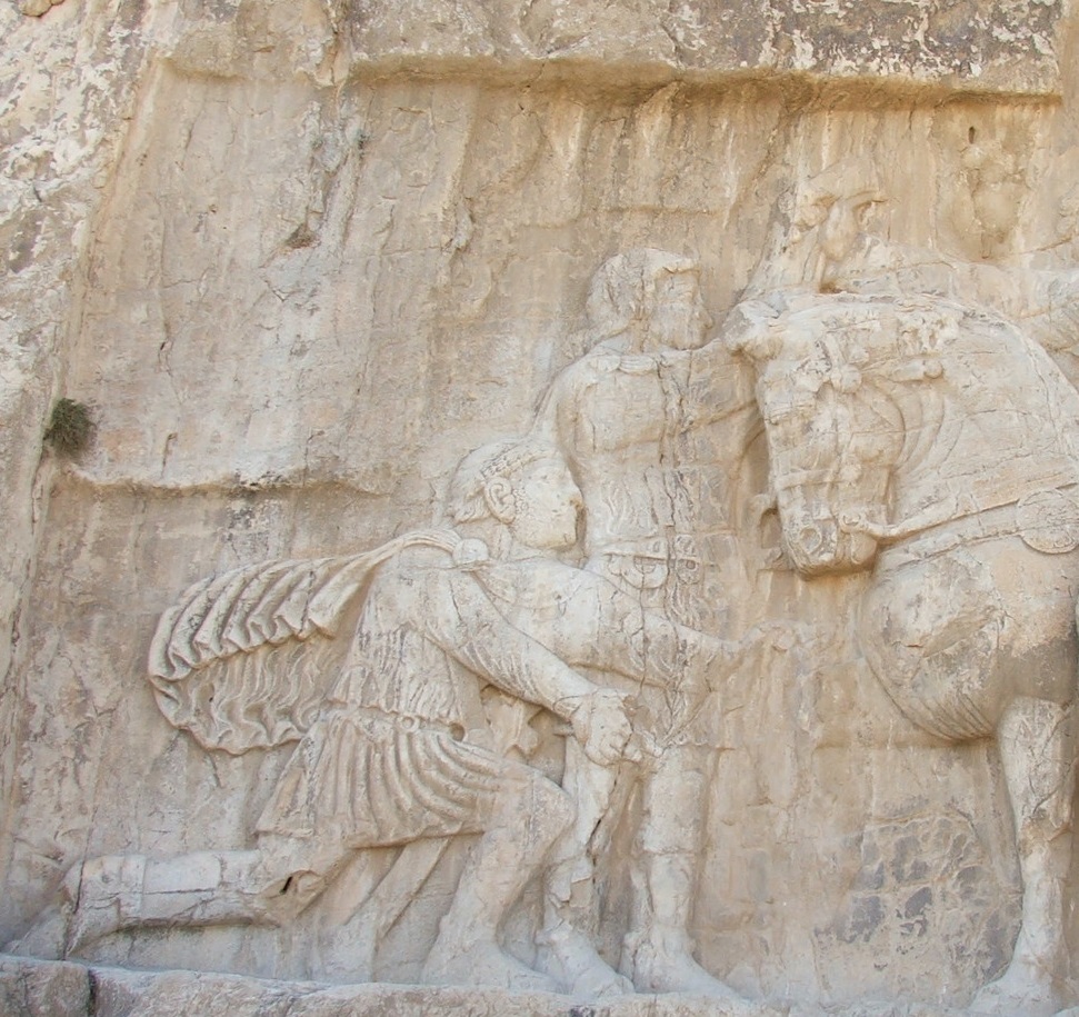 Valérien (253-260 après J.-C.) lauré et cuirassé, le paludamentum flottant dans son dos, s’agenouille devant le roi sassanide. Debout, les mains cachées par ses manches en signe de soumission, Philippe l’Arabe (244-249 après J.-C.) remet des présents au vainqueur. Le bas-relief qui associe deux empereurs romains n’illustre pas une scène historique, mais la puissance du roi sassanide. L’Histoire Auguste recueil anonyme de biographies d'empereurs romains raconte la captivité et la mort de Valérien.