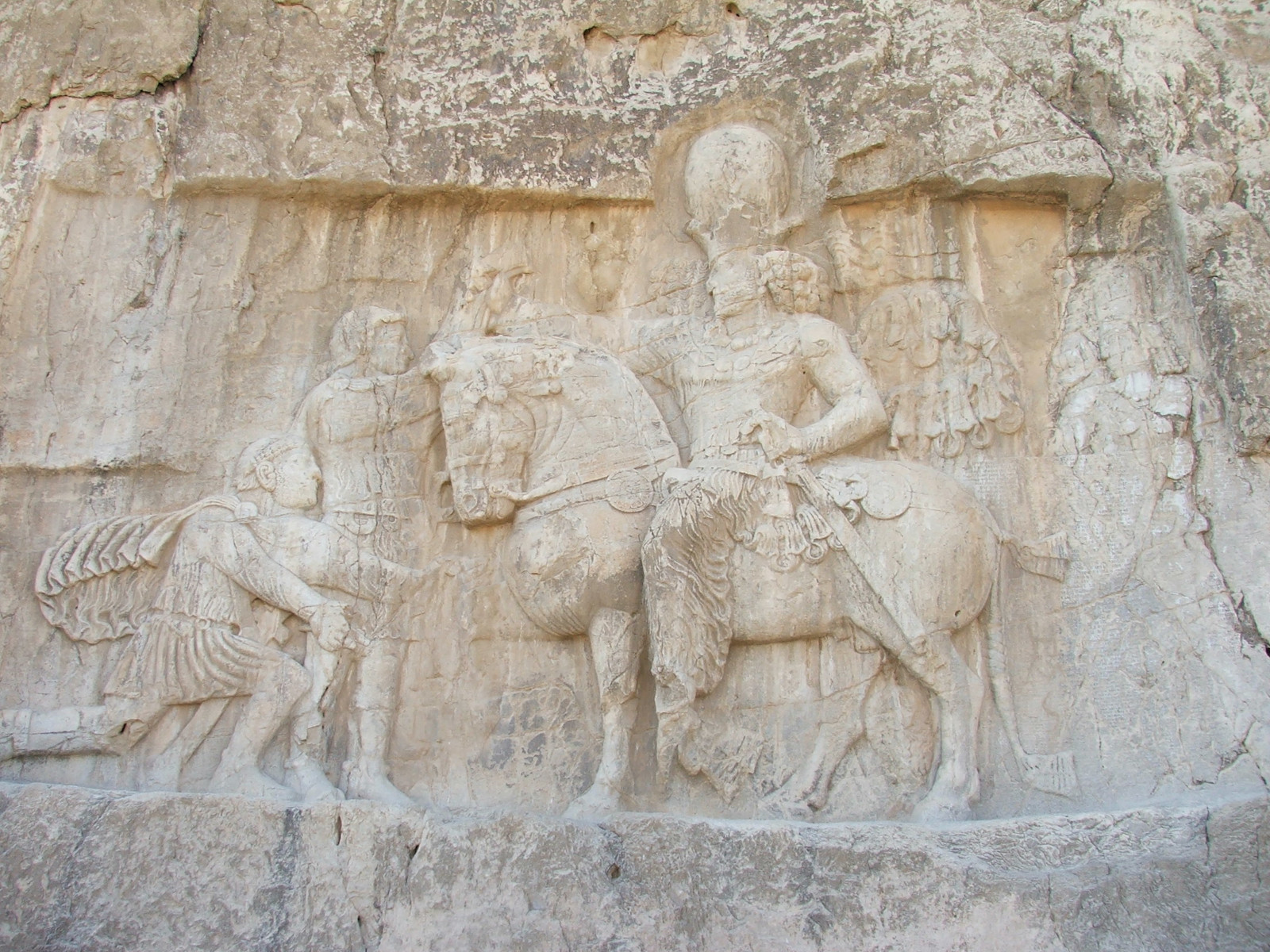 Le plus célèbre bas-relief de Naqsh-e Rostam illustre la reddition de l’empereur Valérien défait en 260 après J.-C. par Shapour Ier lors de la bataille d'Edesse (Turquie). Le roi sassanide, à cheval, habillé de pantalons, porte la barbe nouée au bout du menton. Sa tête est surmontée d’un haut chignon rond le korymbos ou globus. Les fanons de son diadème voltigent derrière lui. Un prêtre se tient derrière le roi, il lui témoigne son respect en recourbant l’index.