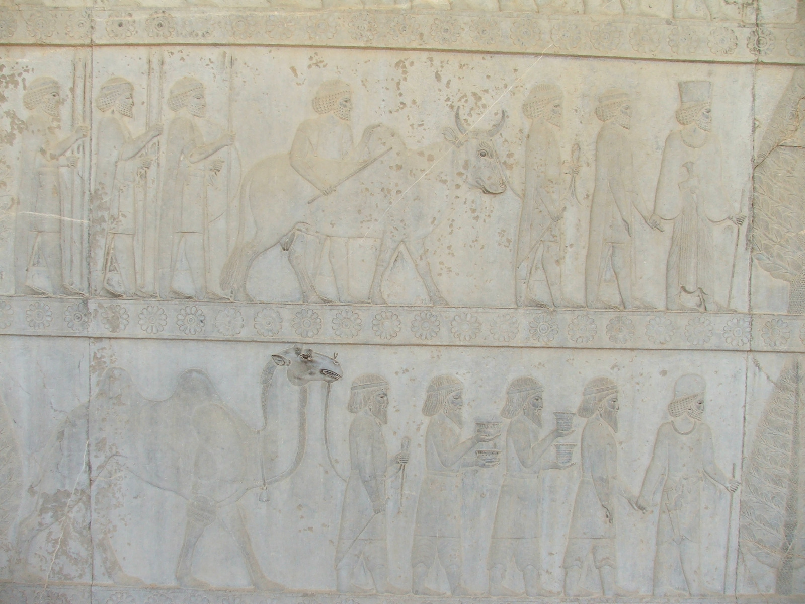 Commencée sous le règne de Darius Ier, l’apadana est achevée par son fils, Xerxès Ier. On y accède en empruntant un escalier aux parois sculptées de bas-reliefs. Les délégués de 23 peuples soumis au roi achéménide, habillés de vêtements traditionnels, offrent au souverain des animaux et des présents. Un guide qui tient par la main le premier des ambassadeurs introduit chaque délégation : en haut, de Gandariens et en bas, de Bactriens (peuples de l’Est de l’Empire achéménide).