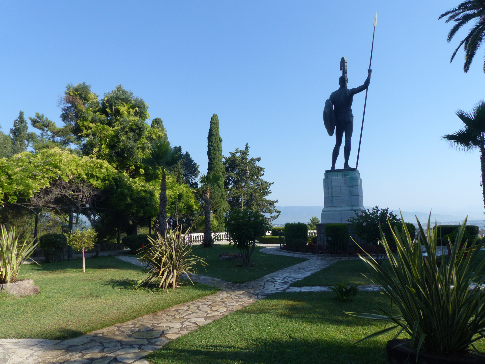 Construit par l’architecte napolitain Rafaele Caritto entre 1889 et 1891 sur l’île de Corfou, l’Achilleion est un palais de villégiature de l’impératrice d’Autriche Élisabeth de Wittelsbach surnommée Sissi (1854-1898). En hommage au héros grec Achille qu’elle admirait, elle souhaita exprimer son goût pour la Grèce ancienne dont elle avait appris la culture et la langue. Adossée au flanc de la montagne, la résidence qui s’étend sur plus de 80.000 m2 domine la mer ionienne.