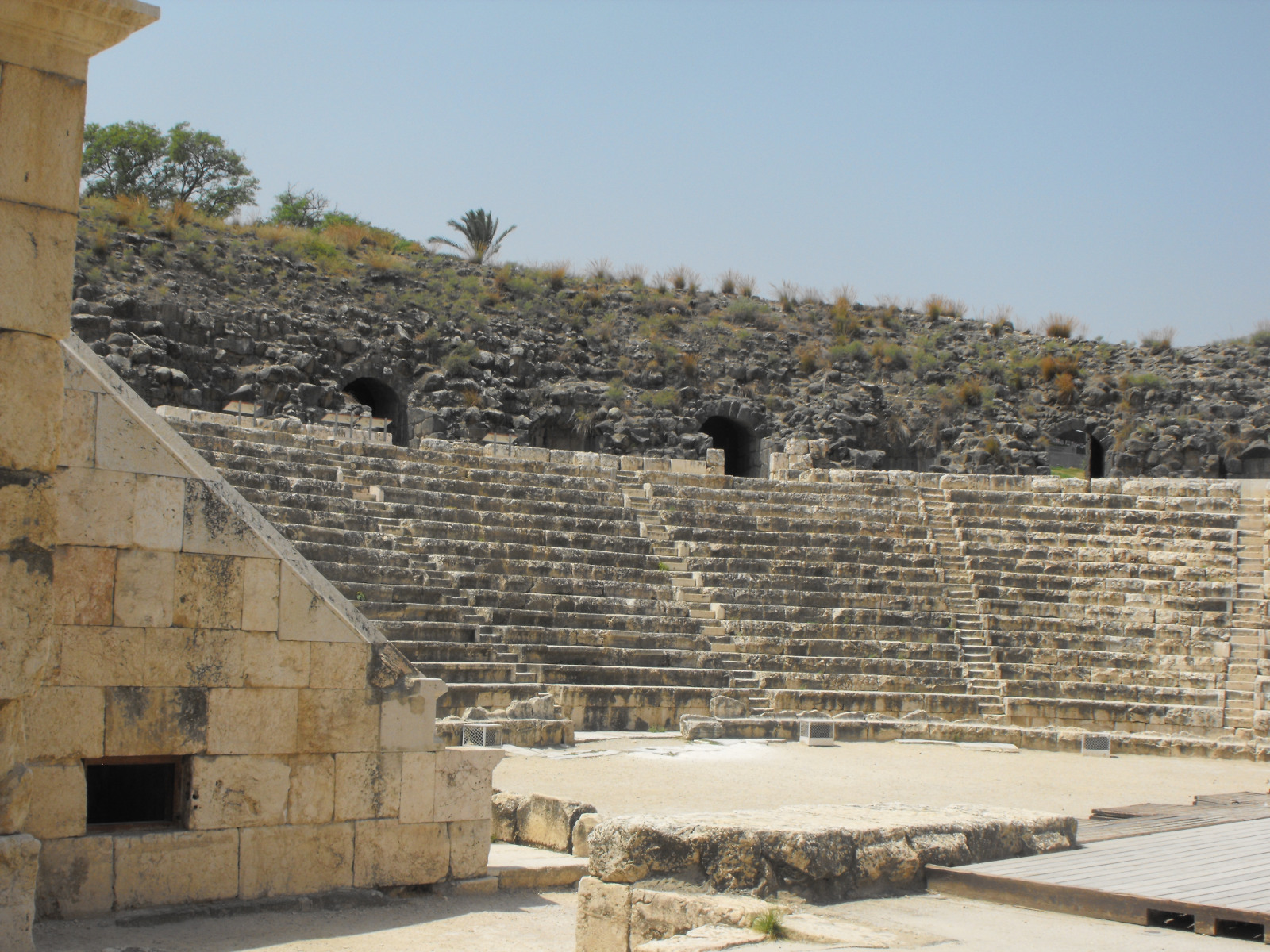 Financé par de riches notables, le théâtre a été édifié sous la dynastie des Sévères (IIe-IIIe siècles après J.-C.) Les gradins inférieurs ont été creusés dans la pente de la colline, tandis que la cavea supérieure est consolidée par un mur, selon les règles de Vitruve. Les 5 000 spectateurs accédaient aux gradins par un vomitorium qui débouchait entre les deux étages de gradins. On aperçoit, en bas au premier rang, les vestiges de bancs en marbre agrémentés d’un dossier et réservés aux notables.