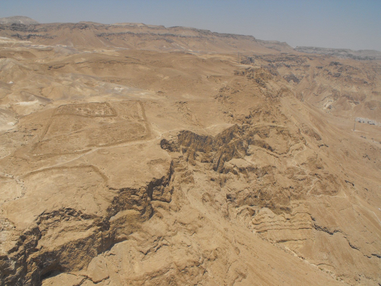 Dès 66 après J.-C. éclate une révolte juive. Massada était la seule place forte qui résistait encore lorsque Flavius Silva devient préfet de Judée (73 après J.-C.). Le général romain établit huit camps en contrebas du piton rocheux pour l’encercler. On en distingue encore facilement le tracé (ici à gauche). Ils avaient trois fonctions : servir de cantonnement aux troupes, défendre les soldats en cas de sorties ennemies, surveiller les voies d'accès pour empêcher toute fuite ou tout renfort.