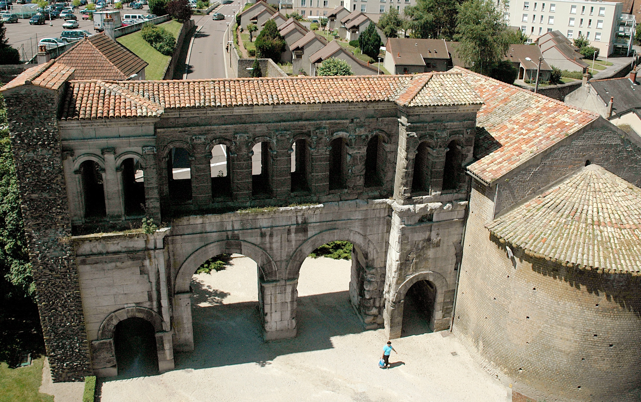 Haute de 14,50 m et large de plus de 20 m, la porte Saint-André permettait d’entrer à l’Est d’Augustodunum sur le decumanus maximus, grand axe est-ouest de la cité. Comme les autres portes de la ville, elle compte deux passages centraux et deux latéraux réservés aux piétons. Elle était encadrée de deux tours semi-circulaires. L’une d’elle encore visible aujourd’hui (à droite) abrite une chapelle. Les cloches de l’édifice religieux sont fixées dans une arcade supérieure de la porte.