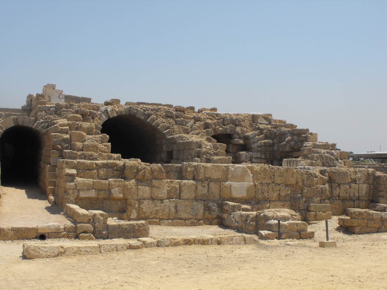 Le port de Césarée que Flavius Josèphe (Antiquités juives, XV,9) déclare « aussi grand que celui du Pirée » à Athènes permettait d’accueillir des navires chargés de matériaux et de vivres. Ces salles voûtées servaient d’entrepôts (horreum). Au IIIe s. ap. J.-C., ils ont accueilli un Mithreum. Le culte de Mithra n’était pas rendu en extérieur mais dans un espace souterrain aménagé avec un autel et des bancs. Pour les fidèles, la divinité contribuait au salut et à la régénération du monde.