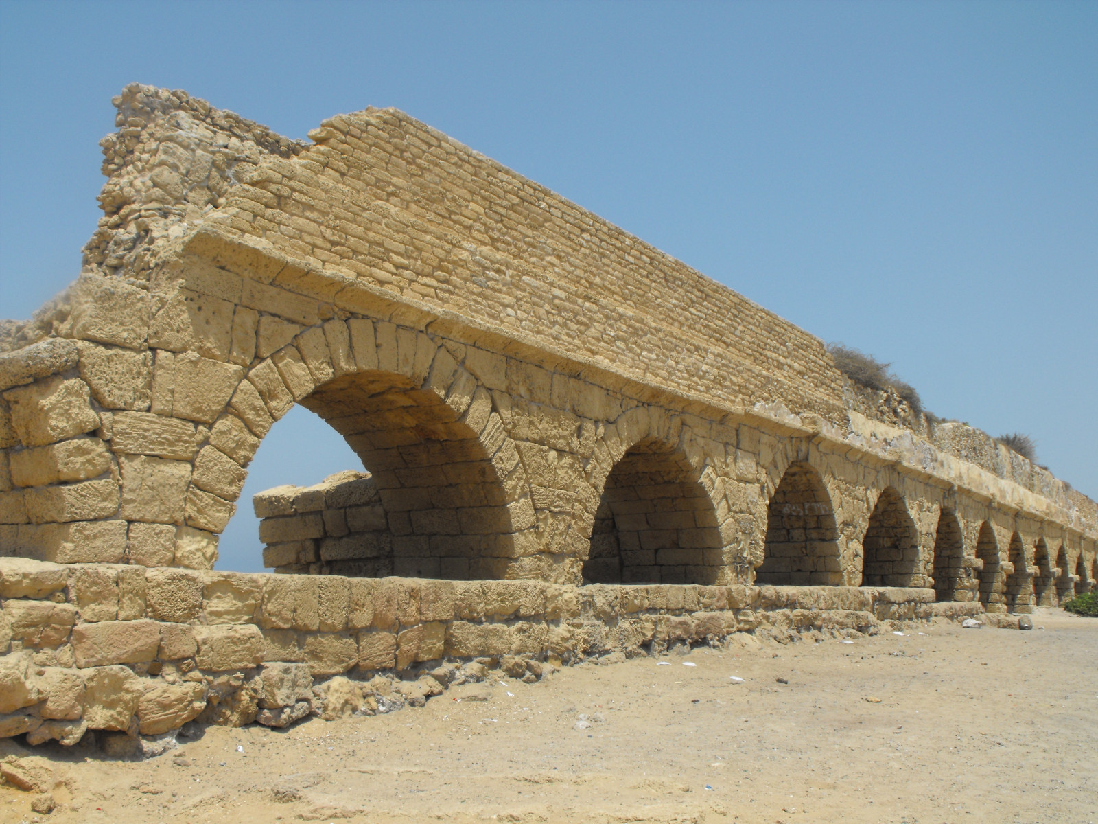 du Carmel situées à une dizaine de kilomètres au nord. On connaît la technique de ce type d’ouvrage grâce au traité de Frontin, Les aqueducs de la ville de Rome. Il alimentait en particulier les thermes de la ville et même une piscine d’eau douce sur la terrasse inférieure du palais d’Hérode, aujourd’hui immergée. L’empereur Hadrien (117-138 ap. J.-C.) consolida l’aqueduc en doublant la structure.