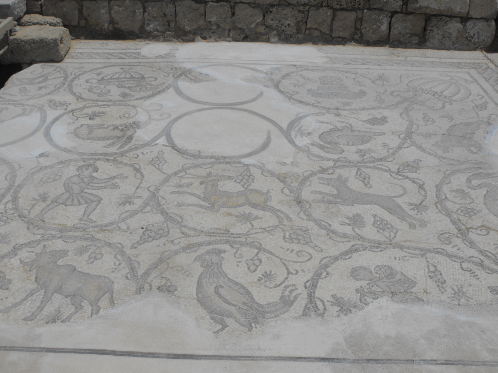 Les sols des thermes et des riches demeures étaient ornés de somptueuses mosaïques en couleurs aux thèmes variés. Ici chaque médaillon est délimité par un rinceau végétal orné de grappes de raisins et constitue un tableau à part entière. Des animaux de la ferme tels un canard ou, au premier plan, un coq se mêlent à des bêtes sauvages comme cette gazelle poursuivie par un chien. Des hommes affairés achèvent la composition. L’un d’eux, en bas à droite, porte une hotte de raisins.