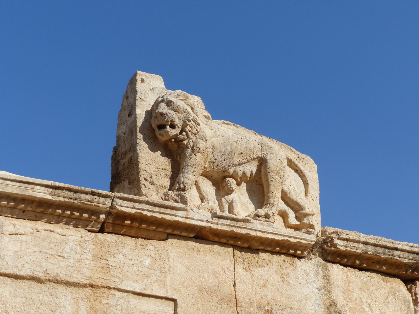 Placés aux angles des bastions, les fauves, symboles de puissance, étaient les gardiens de fenêtres devant lesquelles ils se tenaient en arrêt. Ici, une lionne abrite sous ses mamelles gonflées un lionceau placide. La gueule entrouverte qui laisse apparaître ses crocs, la crinière hérissée et la queue enroulée sur sa patte antérieure illustrent la puissance et la férocité de la mère. Sur les pattes, les veines gonflées apparentes témoignent d’un courant naturaliste plus grec qu’oriental.