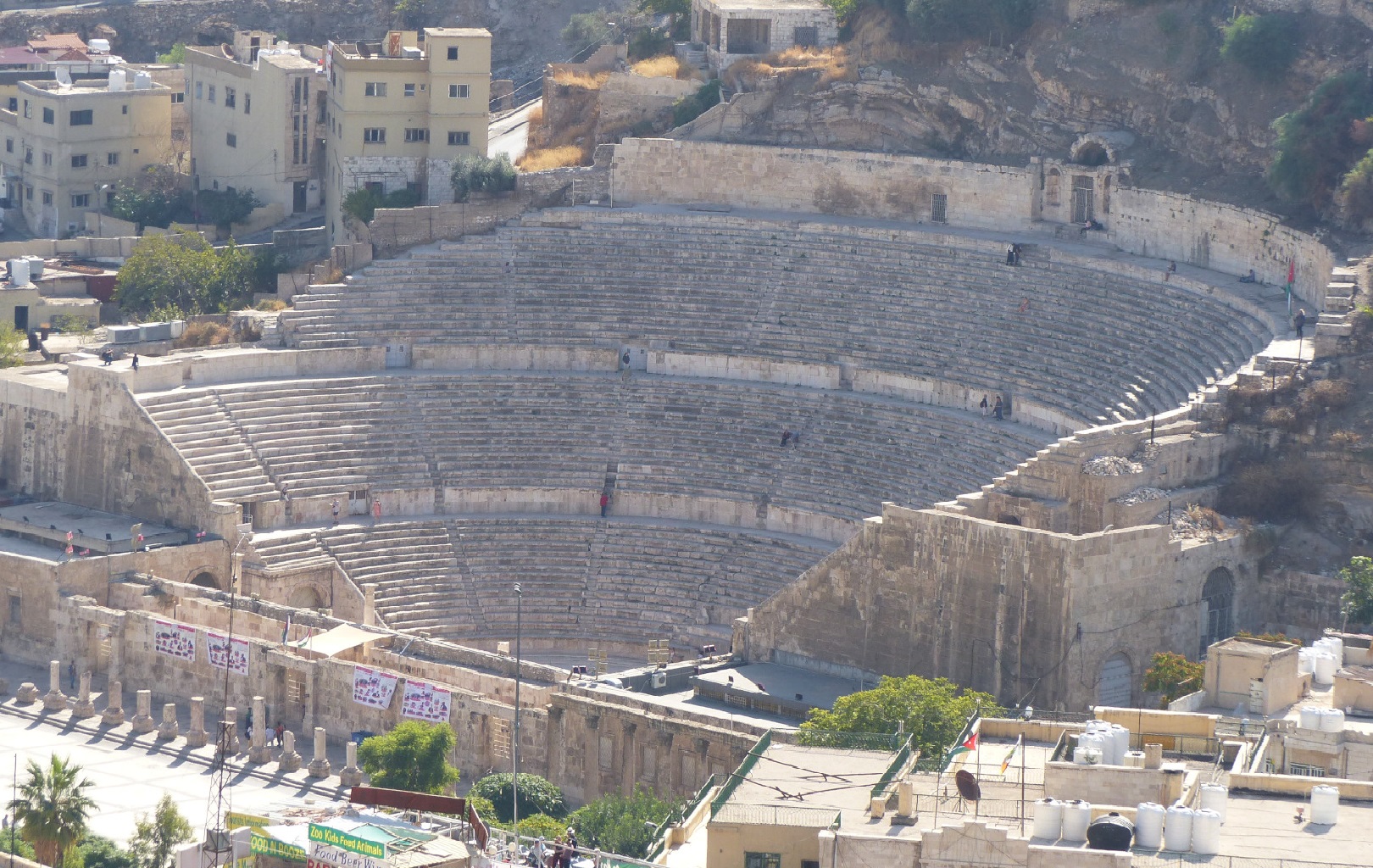 Creusé dans le flanc du jebel El-Taj, le théâtre d’Amman atteint 102 m. de diamètre. Sa cauea est composée de trois rangées de gradins et compte environ 6000 places. Les spectateurs regardent vers le Nord et ne sont donc pas éblouis par le soleil. Les notables installés près de la scène ne se mêlaient pas au peuple assis en hauteur. La petite structure au-dessus du dernier rang de gradins abritait une statue d’Athéna qui occupait une place majeure dans la vie religieuse de la cité.