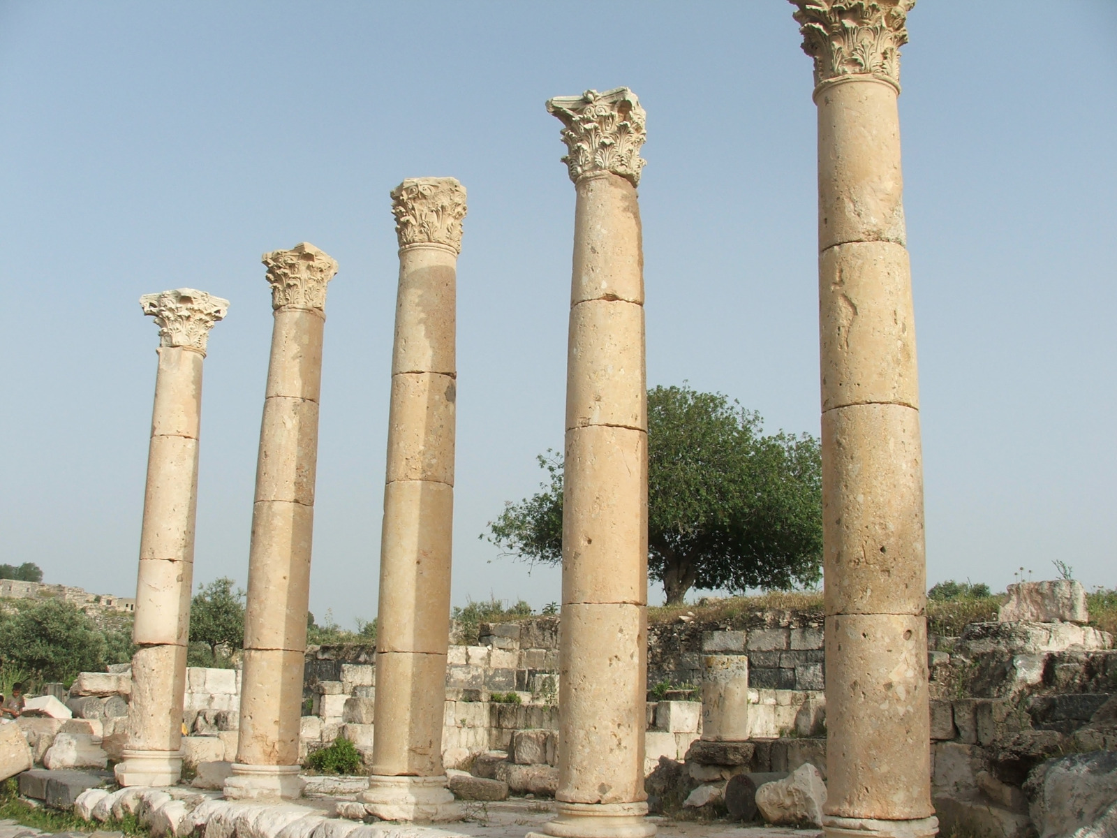 Le decumanus qui parcourt la ville d’est en ouest reliait différents édifices, tels que des thermes, des temples ou plus simplement des boutiques. Subsistent plusieurs colonnes qui encadraient les bâtiments principaux, comme ici cette colonnade aux chapiteaux corinthiens qui longeaient une place (peut-être identifiée à un macellum, marché). À proximité de la rue des boutiques se trouvaient une citerne couverte ainsi qu’un nymphée monumental orné de statues. Il s’élevait sur deux niveaux.