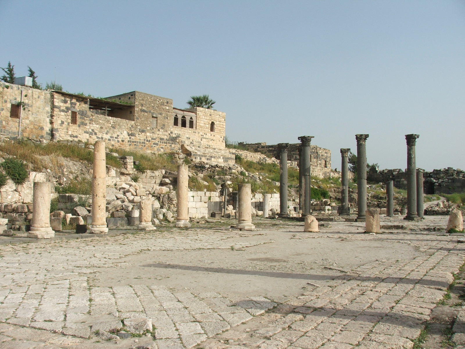 Sur ce pavement en calcaire et basalte de près de 100 m. de long s’élèvent les vestiges de colonnes corinthiennes en marbre blanc qui ornaient une basilique construite au VIe s. ap. J.-C. Les colonnes en basalte noir déterminaient un espace octogonal couvert d’un dôme. Le mur semi-circulaire derrière l’autel laisse penser que l’église servait à des pèlerinages. Elle était probablement dédiée à des saints martyrisés en 303 ap. J.-C. sous l’empereur Dioclétien (284 - 305 ap. J.-C.)