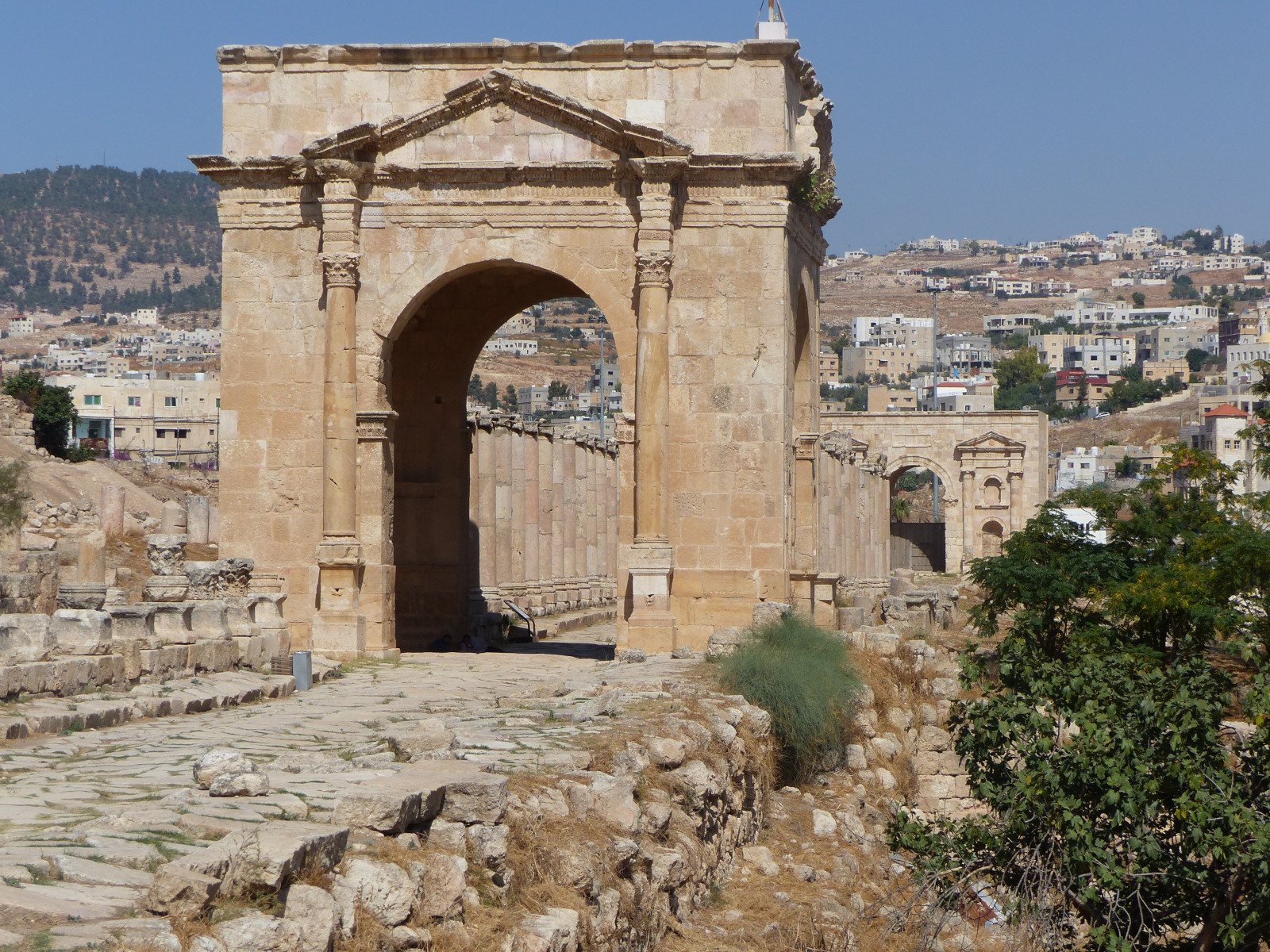À la suite de l'attitude des autorités municipales lors de la première révolte juive (66-73 ap. J.-C.), Gerasa fut saccagée par les troupes de Vespasien. La ville connut alors sa première structuration urbaine dès le début du IIe s. ap. J.-C. Suivant un principe oriental, on décida la construction d’une grande avenue pour relier l'entrée nord de la ville au sanctuaire le plus important, celui de Zeus Olympien. Ce tétrapyle marque l’intersection entre le cardo maximus et le decumanus nord.
