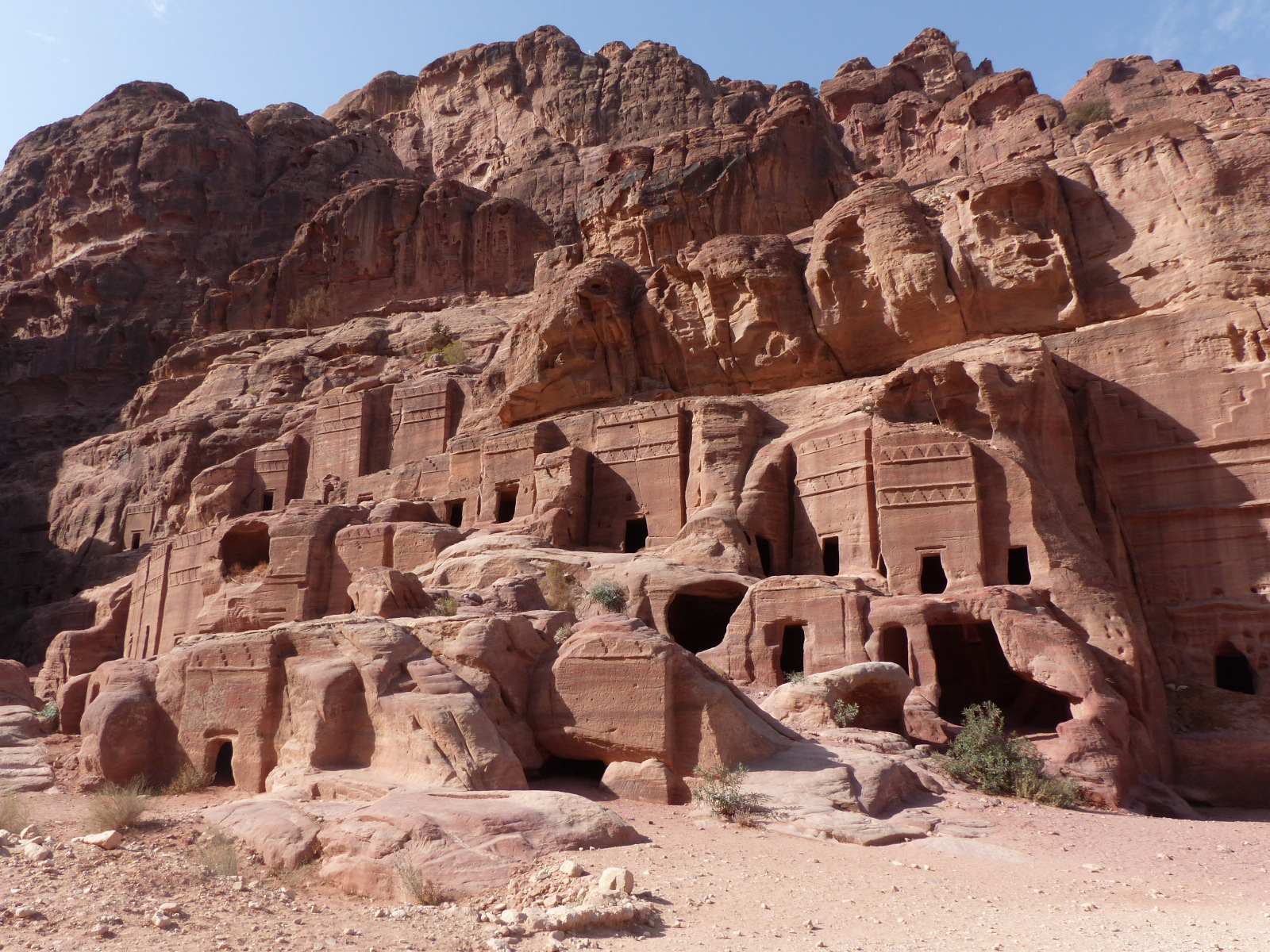 Plus de six-cents tombeaux creusés dans le grès bordent presque toutes les vallées aux alentours de Petra, justifiant la qualification de nécropole. Leur concentration impressionnante a valu à ce secteur le nom de « rue des façades ».Le tombeau-tour apparu au IIe s. av. J.-C. est le type le plus fréquent. Sa façade présente un bloc rectangulaire creusé d’une ouverture et décoré d’une ou deux rangées de merlons à quadruple crénelure que les Nabatéens ont empruntés aux cultures syro-phéniciennes.