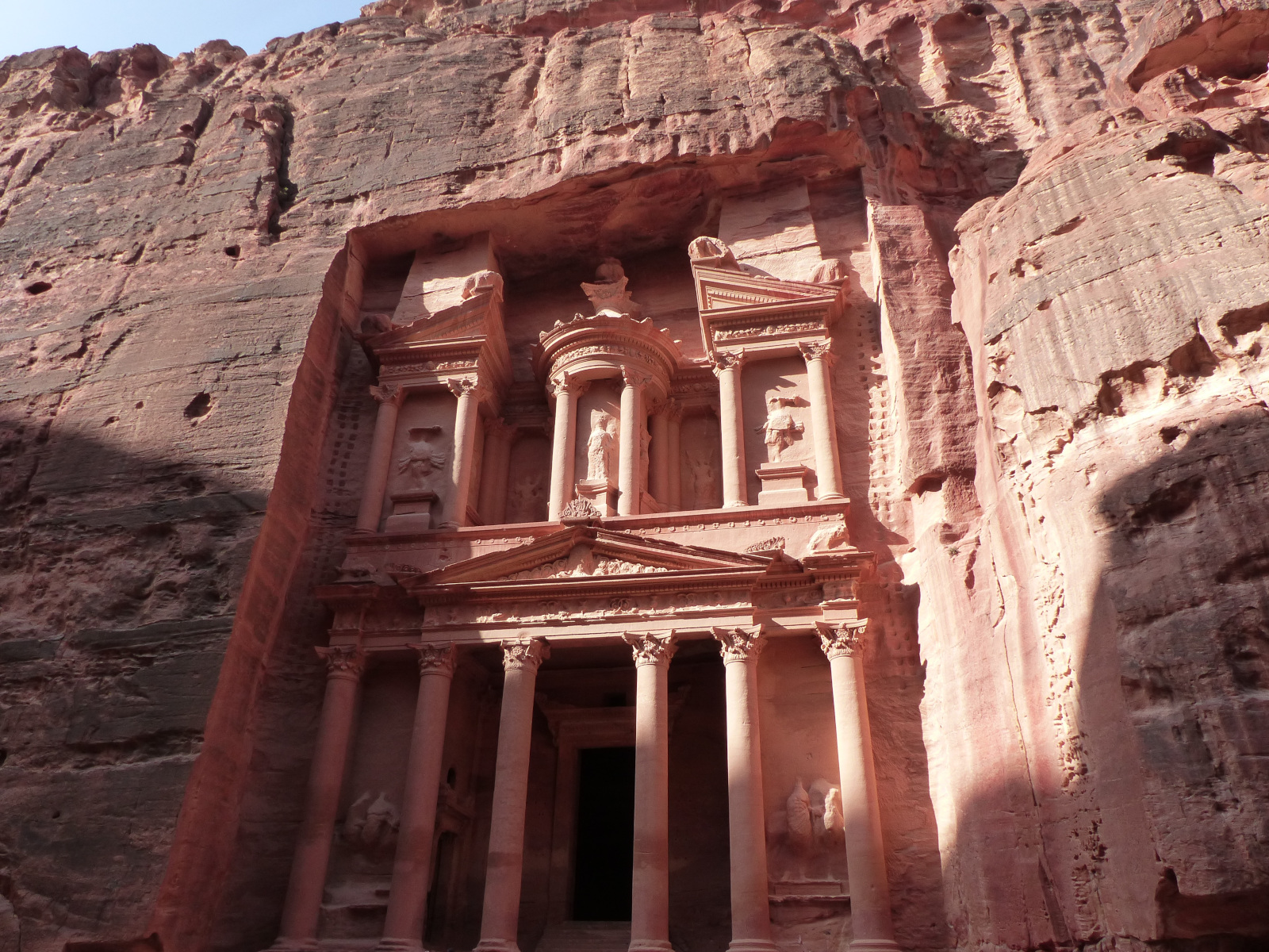 Chef-d’œuvre ciselé dans le grès rose, la Khazneh s’élève sur 40 m de haut. Sa façade est un joyau de l’art hellénistique alexandrin du Ier s. ap. J.-C. La partie basse est composée d’un fronton triangulaire orné d’une frise et soutenu par six colonnes corinthiennes. L’acrotère est orné d’épis de blé et d’un disque entre deux cornes de vache. On l’interprète comme une représentation d’Isis. Dans l’entrecolonnement, on reconnaît deux statues d’hommes à cheval, les Dioscures Castor et Pollux.