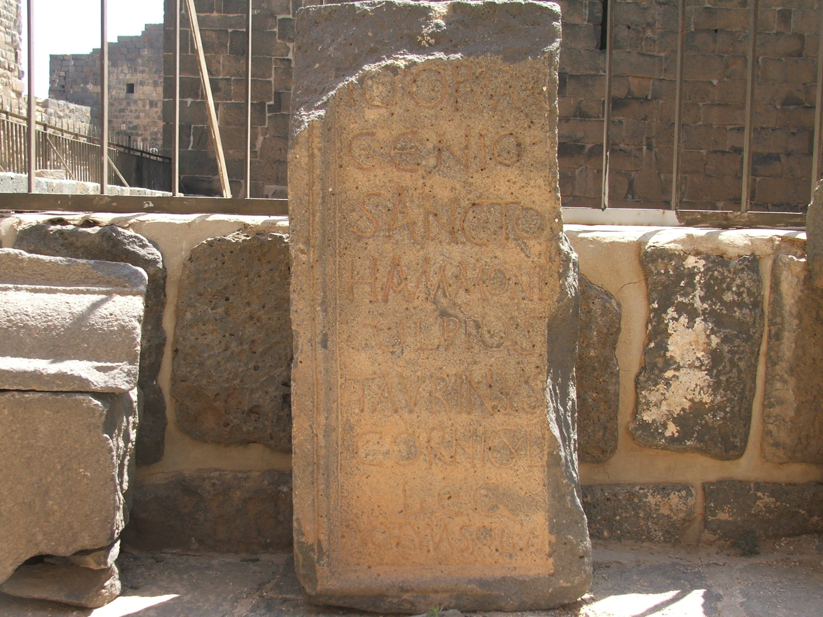 Sur cette inscription (IGLS-13-1, 9010), Ulpius Taurinus sous-officier de l’armée romaine basée à Bosra s’acquitte d’un vœu «À Jupiter Optimus Maximus Genius Sanctus Ammon». Zeus ou Jupiter Ammon est le dieu le plus représenté à Bosra. On ignore la localisation de son sanctuaire, mais on sait qu’il fut détruit en 269-272 ap. J.-C. par les soldats de Zénobie, reine de Palmyre. Certaines monnaies frappées à Bosra représentent la divinité auprès de la Tyché poliade, déesse protectrice de la ville.