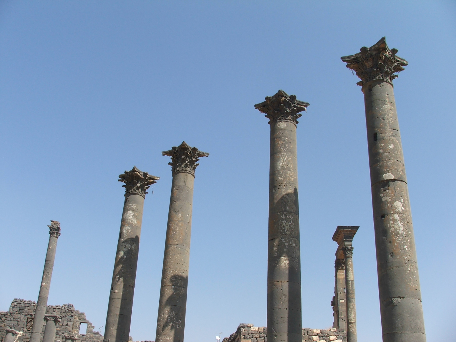 Au carrefour sud des deux principaux axes de la ville s’élèvent quatre colonnes aux chapiteaux corinthiens. Elles ornaient la façade d’un monument public dressé de hauts murs avec une grande abside centrale. À l’arrière-plan, à droite, deux colonnes coiffées d’un entablement richement décoré sont les vestiges probables d'un nymphée, fontaine monumentale. La ville construite sur un plateau basaltique a fourni le matériau de ces édifices qui ont résisté à l’érosion et aux tremblements de terre.