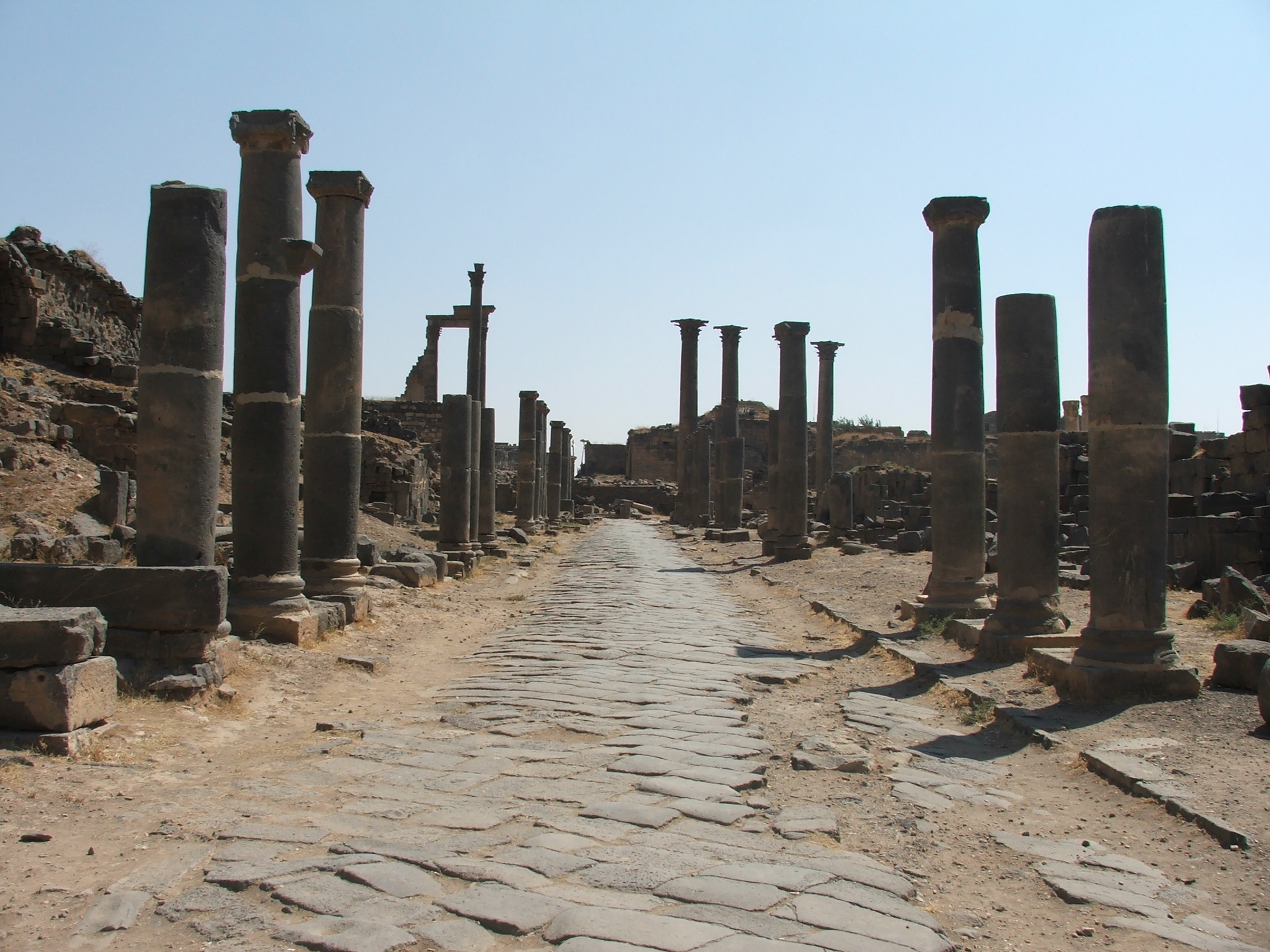 Sous l’influence romaine, Bosra se développe afin de créer un décor digne d’une capitale provinciale. On cherche à renforcer la géométrie orthogonale des rues. L’axe principal est-ouest, le decumanus, se dote de dalles obliques pour faciliter le déplacement des chariots. Les voies principales s’équipent de portiques au début du IIIe s. ap. J.-C. Les rues totalisent un nombre exceptionnel de colonnades, compte tenu des dimensions réduites de la ville, comptant jusqu’à 3 kilomètres de longueur !