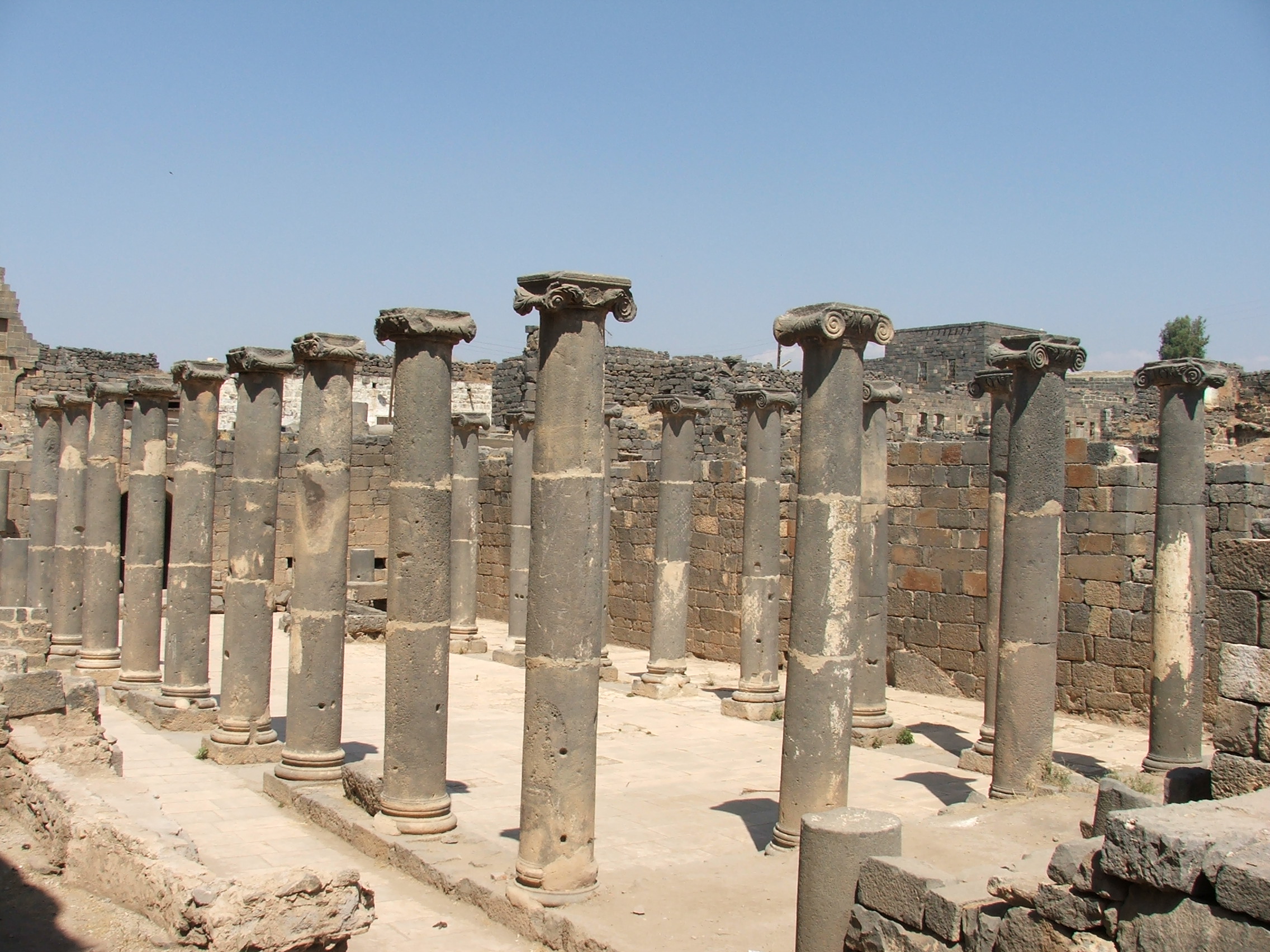 On compte deux établissements de thermes à Bosra alimentés par un aqueduc qui captait l’eau dans le massif volcanique du djebel al-Arab. Éléments majeurs de l'urbanisme romain, ils témoignent de la puissance et de la richesse de la ville. Construits au cours du IIe s. apr. J.-C., les thermes du sud ont été agrandis jusqu’à leur abandon à la fin de l’époque omeyyade. Sur un côté de l’édifice se trouvait une palestre entourée d’un portique. Ses colonnes ioniques sont taillées dans le basalte.