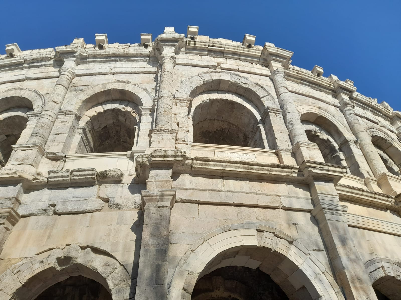 La structure de l’amphithéâtre repose sur une succession de murs épais et de voûtes qui soutiennent l’ensemble des gradins. Pour protéger les spectateurs du soleil, la cauea composée de 34 rangées de gradins était abritée par un uelum. Il s’agissait d’une grande toile mobile tendue sur des câbles que portaient 120 mâts plantés dans des consoles. On aperçoit ici au sommet de l’attique qui couronne l’édifice, les consoles où l’on fixait les piliers de bois. Les arènes restent un lieu de spectacle.