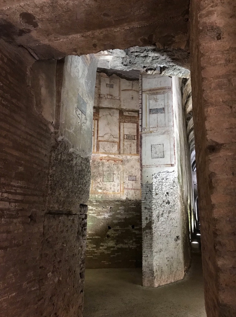 Vue des ruines de la Domus aurea ("la Maison dorée"), l’immense palais que Néron se fit construire sur 80 hectares au pied du mont Oppius (enseveli sous les remblais et partiellement dégagé aujourd’hui). Elles furent redécouvertes vers 1480 : Raphaël et Michel-Ange descendirent, torche en main, dans ces salles souterraines ; sur les murs subsistaient les traces d’une décoration picturale insolite qu’on nomma "grotesque", par référence aux grottes.