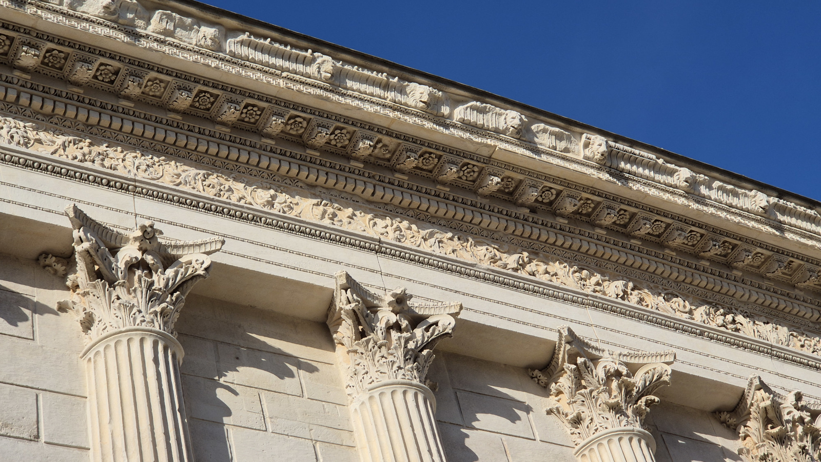 Le schéma architectural pseudopériptère avec son alignement de trente colonnes corinthiennes engagées sur les trois côtés reprend celui du temple d’Apollon in Circo de Rome. Les éléments décoratifs imitent ceux du temple de Mars Vltor (vengeur) et de l’Ara Pacis (Autel de la Paix) de Rome. Les ornements de la frise en rinceaux d’acanthes et de la corniche à modillons, symboles de l’âge d’or du règne d’Auguste, témoignent de l’intégration de la culture impériale dans la ville de Nemausus.