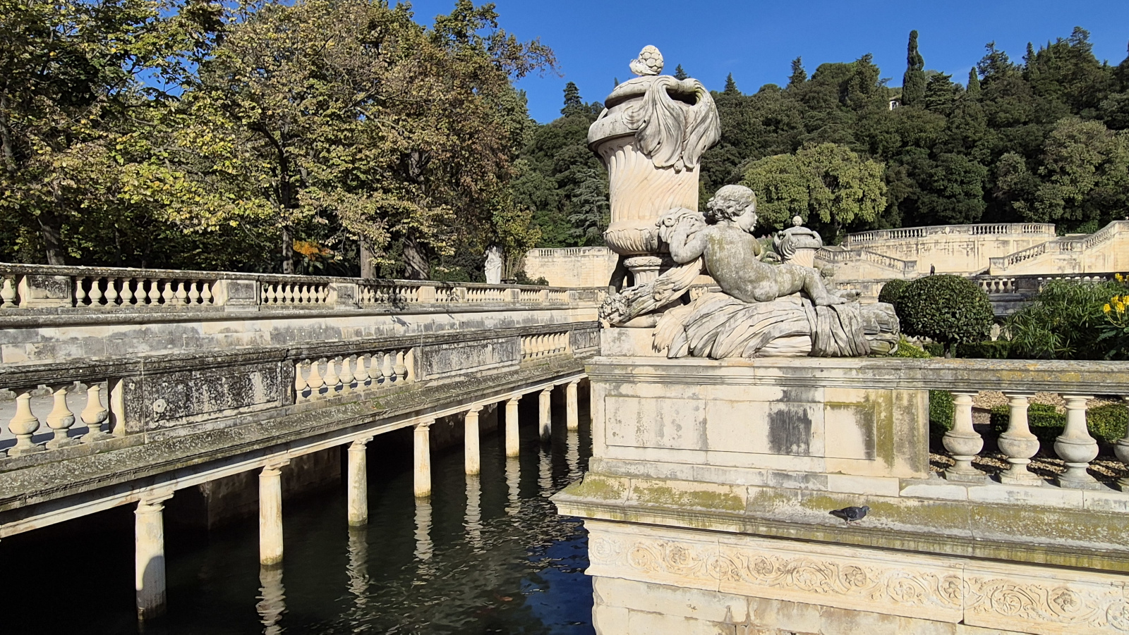 Les actuels Jardins de la Fontaine sont installés à l’emplacement même où les Volques Arécomiques rendaient un culte au dieu celte Nemausos. Au Ier s. ap. J.-C., on y a édifié un Augusteum dédié au culte de la famille impériale. Des propylées en marquaient l’entrée ; un nymphée consacrait la source et un autel voué au culte impérial se dressait au centre d’une plateforme ornée de colonnes libres à chaque angle. À proximité se trouvaient des thermes alimentés par l’aqueduc ainsi qu’un théâtre.