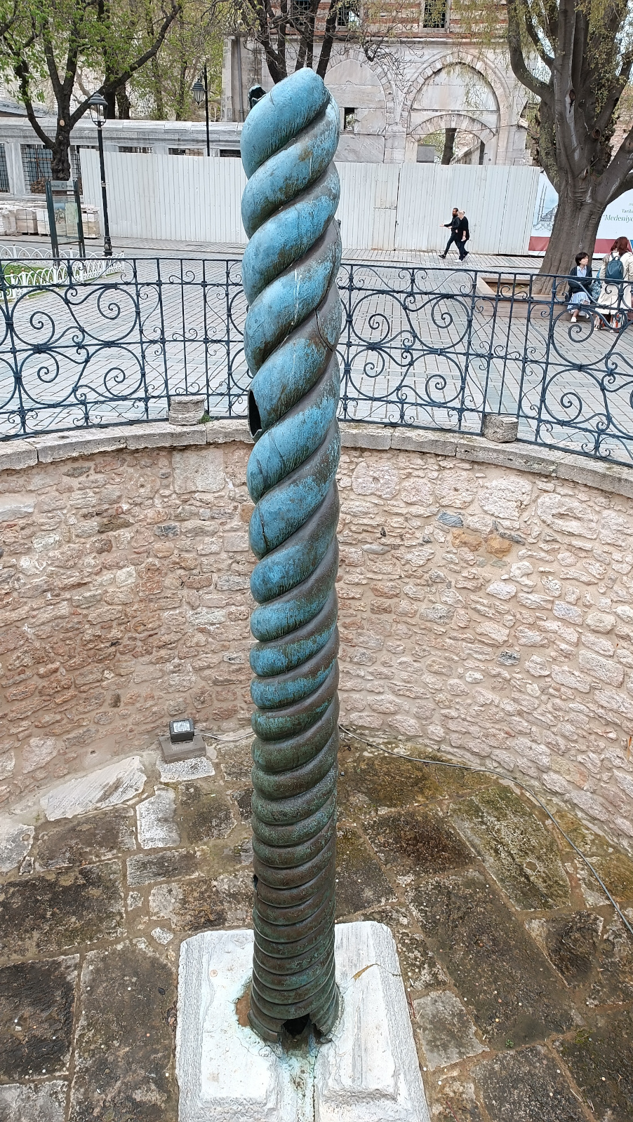 La colonne serpentine ornait le centre de la spina de l’hippodrome. Les torsades de bronze de son pied représentaient trois serpents enlacés qui supportaient les pieds d'un cratère d'or. Constantin fit venir du sanctuaire de Delphes ce trésor que les Grecs avaient offert au dieu Apollon après leur victoire à Platées en 479 av. J.-C. Malgré sa petite taille, l’offrande occupait un emplacement privilégié, sans doute parce qu'elle représentait un important symbole solaire et une image de victoire.