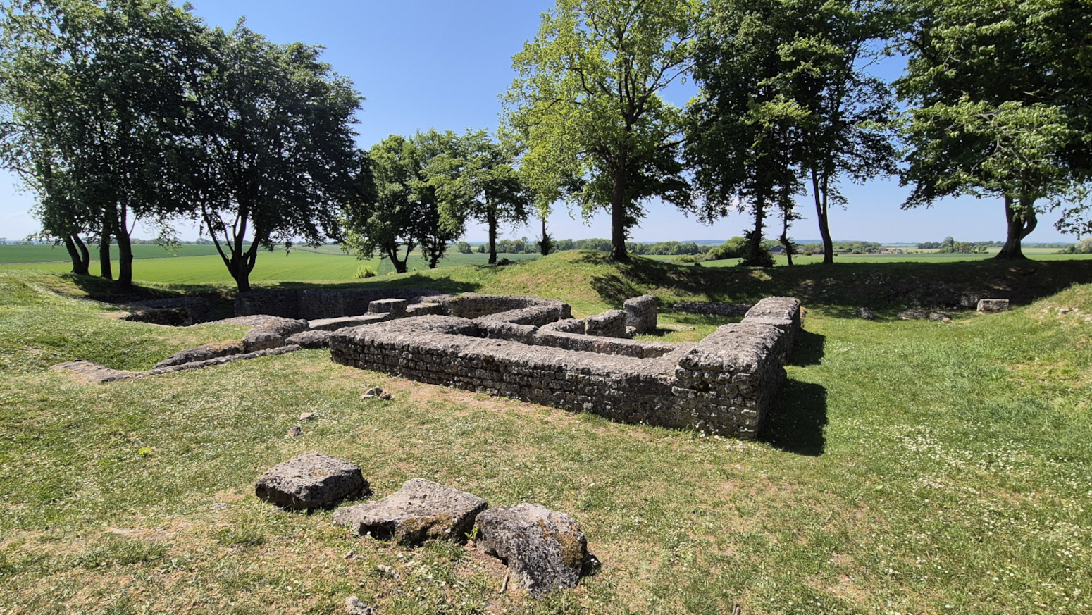Le complexe thermal de dimensions modestes, 52 x 22 m., se divise en plusieurs espaces. À droite se trouvait une palestre entourée d’un portique. Un couloir transversal qu’on utilisait comme vestiaire permettait d’accéder aux thermes et de passer successivement, ici de droite à gauche, dans les deux petites salles dallées et alimentées en eau froide par le mur est (frigidarium) puis dans les salles chauffées par un système d’hypocauste. Le foyer principal se trouvait à l’extrémité gauche.
