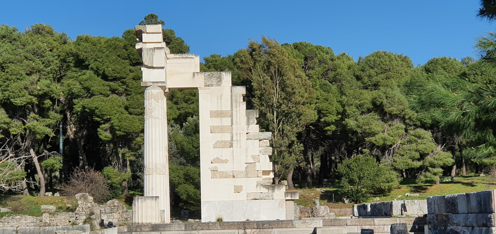 Construit à la fin du IVe siècle avant J.-C., ce bâtiment appelé d’abord « gymnase » est désormais identifié comme un vaste ensemble de salles de restauration ou hestiatorion de 76 mètres par 70 mètres. S’y tenaient des banquets rituels puisqu’on y a trouvé des restes de foyers et de nourriture. Son entrée monumentale dorique a été remontée selon la technique architecturale de l’anastylose. À l’époque romaine, les propylées furent transformés en temple d’Hygie, fille d’Asclépios et déesse de la bonne santé.